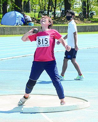 砲丸投げ女子70歳以上クラス、力の限り重量3㌔の砲丸を飛ばす