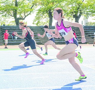 100㍍女子30歳、40歳、50歳、55歳、85歳以上クラス、号砲とともに駆け出す