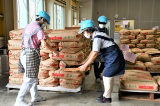 検査のサンプルを各袋から抽出。主力品種のコシヒカリなど集荷も本格的に始まった