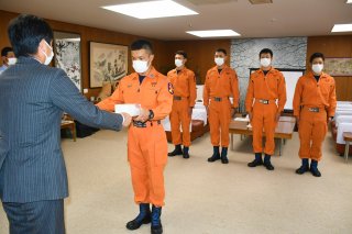 宮尾消防士長ら5人が報告のため市役所を訪れ、中川市長から表彰を受けた