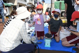 客にブドウの房を選んでもらい、その場で計量して販売価格を決定
