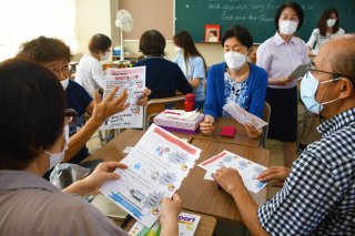 上越警察署提供の英訳された特殊詐欺のチラシなどを使用。石田さん(後方右から2人目)の指導で、会話も織り交ぜて学んだ