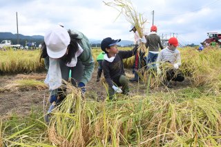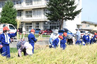 田んぼの外側に植えたこがねもちを鎌で刈り取っていく児童たち