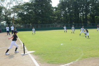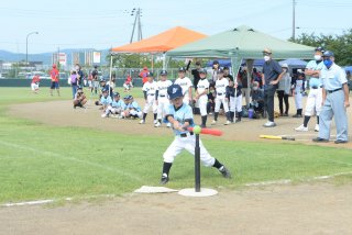 バッティングティーに置いたボールを思い切り打つ子どもたち
