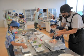 漁業士ら大人に習い、地元産を使った魚料理を体験する児童