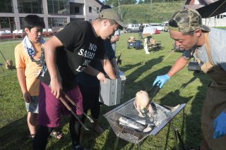 ふたを開けた缶ビールを丸鶏に刺して炭火で焼き上げる「ビア缶チキン」作り