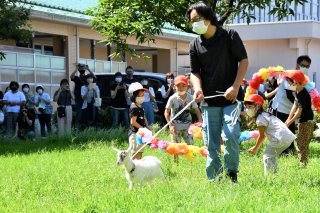 楽しみに待っていた子ヤギを優しく迎えた1年生
