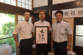 ブランド名「あさひかがやく」を手にする(左から)牛田さん、田邊さん、布施さん