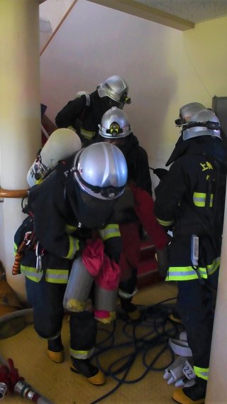 解体予定の旧保育園園舎を使い訓練。実際の救助、消火活動と同様に、破壊や放水を行う貴重な機会に約40人が参加した