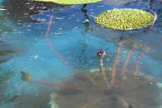 6日に開花したオニバスの花(右)。水中には膨らんだ閉鎖花(左)もあり、種子の採取が期待される(6日午前11時ごろ撮影)