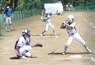 大会前、コーチ陣が投げる球で打撃練習を重ねる選手たち。山川監督(左奥)が見詰め、アドバイスを送る