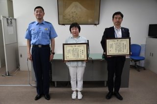 小森さん(中央)と秋山さん(右)に感謝状を贈呈。連携して特殊詐欺被害を未然に防止した