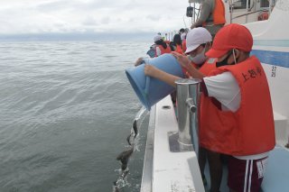 「うみがたり」の沖でヒラメの稚魚を放流する子どもたち