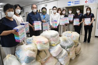 7日は渡邉部会長(左から4人目)ら10人がえがおと虹の森ふもとを訪問。古タオルとティッシュボックスを寄贈した