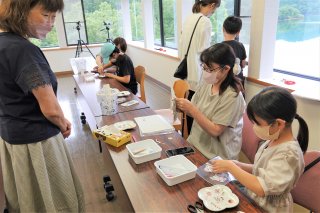 講師の布施さん(左)に手ほどきを受けながら、ポーセラーツを楽しむ参加者たち
