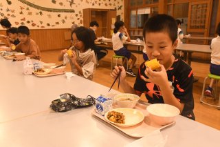 前日朝に収穫したばかりのトウモロコシをがぶり。甘さに笑みがこぼれた(宝田小)