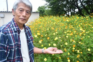 キバナコスモスの植栽に取り組む池田さん。フラワーパークでは花が見頃を迎えている(三和区日和町、8月30日撮影)