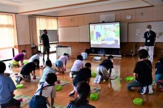 「新潟PUSHプロジェクト」の心肺蘇生法講習を受講、胸骨圧迫を実践する西海小5、6年生児童