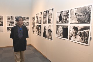 圡肥さんと展示写真の一部。ウイグルに暮らす人々のありのままの表情を撮影した