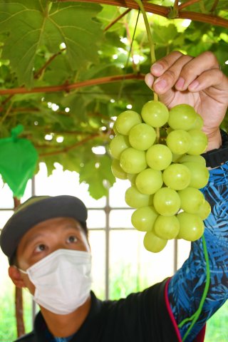 カネコ農産で初収穫を迎えたシャインマスカット。金子祐樹さんも「3年間の苦労が報われた」と品質に太鼓判を押す(2日撮影)