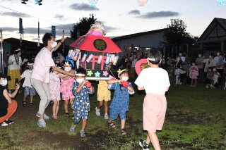 年長児はアマビエみこしを担いで夕暮れの園庭を1周した