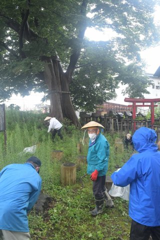小雨が降る中、大ケヤキ周辺の除草をする参加者