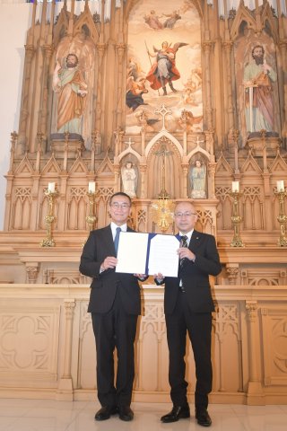 大聖堂の利用に関する協定書にサインした上越教育大の林学長(右)と平安セレモニーの青木社長
