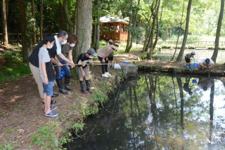 糸を垂らし、アメリカザリガニを釣る