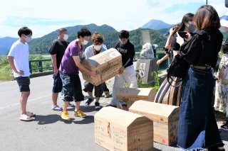 姫川に架かる翡翠橋の橋桁に納めたタイムカプセルを20年の時を経て運び出した大野小の卒業生(13日)