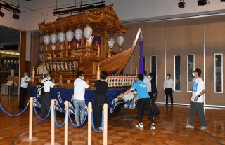 うみまち作品展で直江津屋台会館に飾られる御幸町の屋台。16日に展示作業を行った