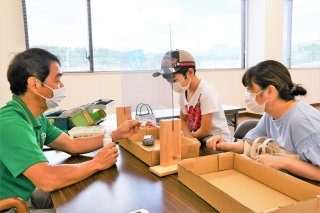 自由研究で収集した石を鑑定してもらう小学生親子ら(糸魚川信用組合本店2階)