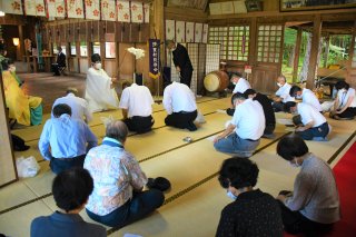 拝殿で慰霊祭を実施。コロナ禍で出席者は例年の半分程度だったが、追悼と平和への思いを新たにした