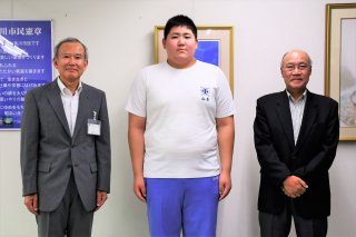 全中相撲に出場する糸魚川東中3年の山本大吾選手。靍本教育長(左)と清水スポーツ協会会長から激励を受けた