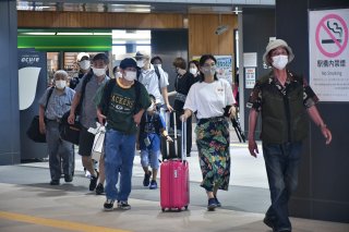 ボストンバッグやスーツケース、お土産の入った袋を持って実家などへ向かう人たち(11日午前10時45分ごろ、上越妙高駅)