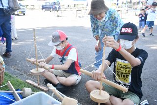縄文体験のコーナーでは、子どもたちが火おこしに挑戦した