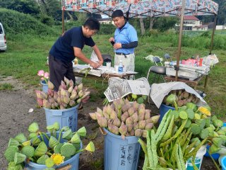 ずらりと並ぶハスの花とぐし、巻き葉