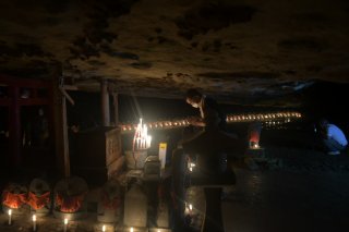 半月形の洞窟の中で静かに手を合わせる地元の人。近年は撮影スポットとして知られるようになり、写真愛好家の姿も見られた