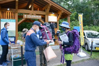 登山者に安全な登山を呼び掛けた(11日午前5時30分ごろ)