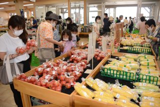 お盆の準備にと地場産食材を買い求める人でにぎわった(あるるん畑)