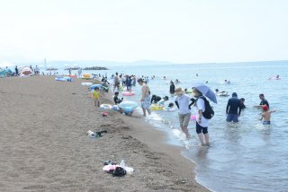 穏やかな天候と波となり、家族連れらが海水浴を楽しんでいた(7日午後1時ごろ)