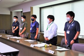 豪雨被害に対する応援要請を受けて糸魚川市から市職員6人を現地に派遣。出発式が行われた