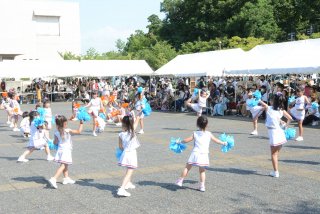 午前から夕方まで屋外ステージはさまざまな催しや発表。NPO法人ワセダクラブ北信越支部チアリーディングスクールの発表には家族ら多くの観衆が訪れた