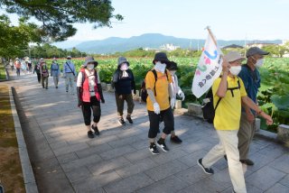 歴史博物館前を出発し西堀を歩く参加者