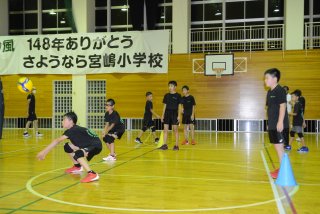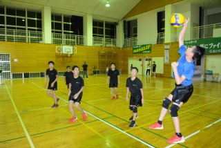 プレーの起点となるレシーブを反復練習するメンバー(旧宮嶋小体育館)
