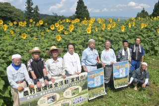 大輪のヒマワリと「うつぎ会」のメンバー