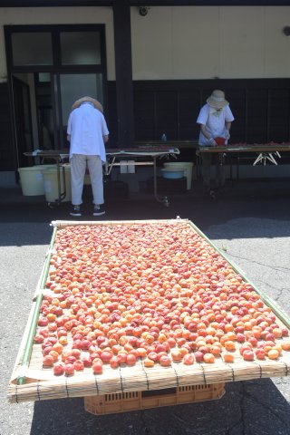夏の強い日差しが梅の表面を殺菌し、水分を飛ばしておいしくする(5日、正善寺工房)
