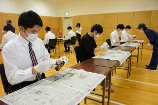 専用の粉を使って指紋を浮かび上がらせる鑑識作業を体験する参加者