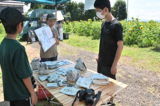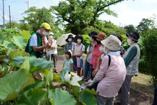 笹野さん(左)からハスについての豆知識を聞く参加者