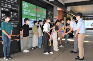 糸魚川市中学生広島派遣研修の出発式。平和への祈りを込めて作成された千羽鶴が代表生徒に託された(5日、糸魚川駅自由通路)