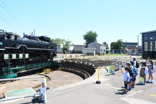 転車台で回るSLを見学